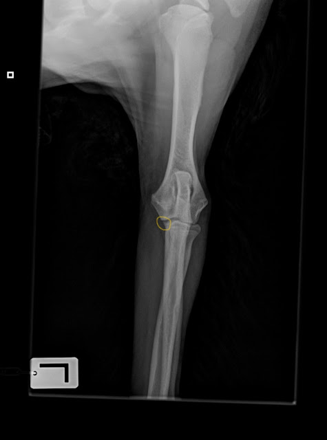 Soitin pariin paikkaan, ja niistä kerrottiin etteivät arvioi kasvavan koiran luustokuvia, koska niissä on vielä kasvulinjat auki eikä ole kuvien katsomisesta tarpeeksi kokemusta. No päästiin sitten Kalliolan eläinklinikalle aivan ihanalle Erikalle Johanssonille. Häntäkin etukäteen kehuttiin, että on kyllä todella ammattitaitoinen ja osaa ne kuvatkin katsoa. Otettiin kuvat olista, kyynäristä ja vasemmasta kyynärästä vielä edestäkin. Tuohon alempaan kuvaan ympyröin keltaisella sen kohdan, joka saattaa olla irti ja joka helposti kasvuiässä murtuu. Ja sitten ollaan siinä varislisäkkeen irtopala-tilanteessa, mikä esim. meidän Jeculla oli ja leikattiin. Josta syystä myös saatan olla hiukka enempi jännäkakka housussa tässä tilanteessa.